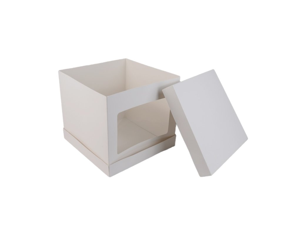 Bílá dortová krabice s okénkem. Krabice je z vnitřní strany bílá.