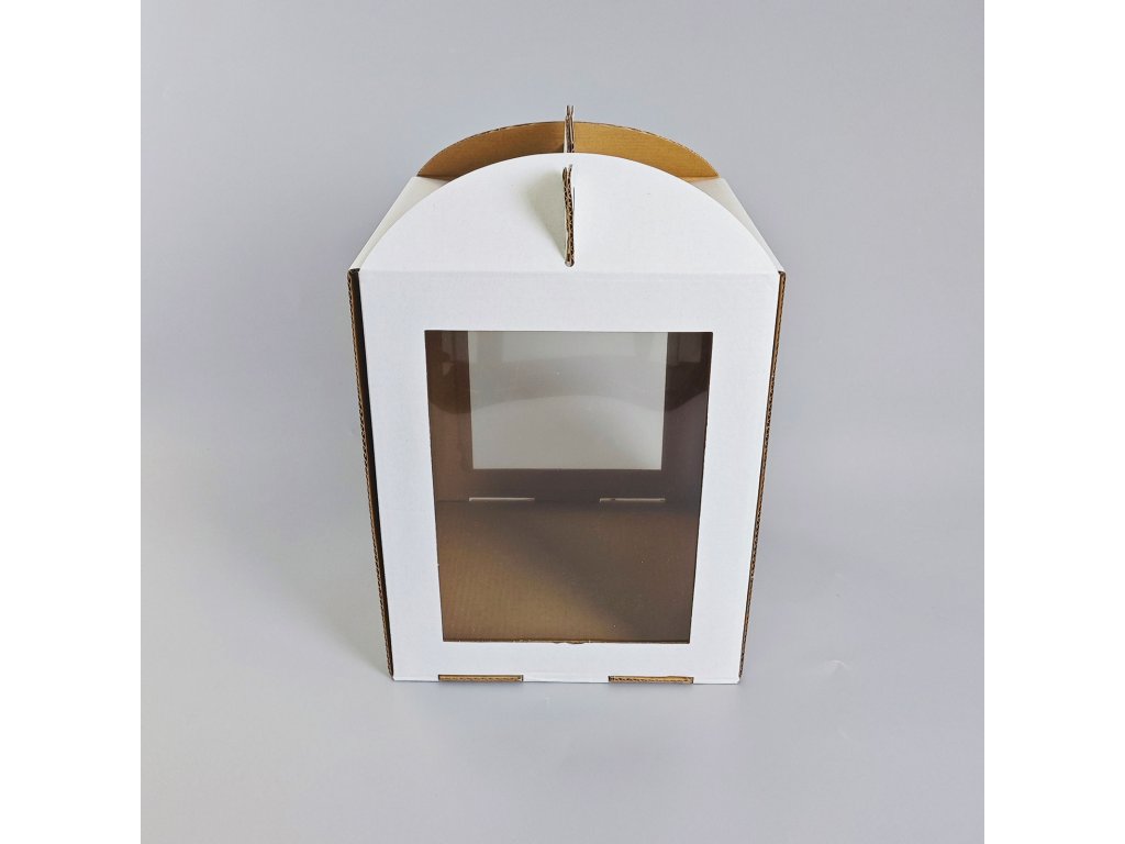 Vyrobena z pevného, kvalitního kartonu, který zajišťuje stabilitu a ochranu při přepravě. Dvě průhledná okénka umožňují snadné nahlédnutí na obsah, což ocení nejen zákazníci v cukrárně, ale i obdarovaní při předání dortu.