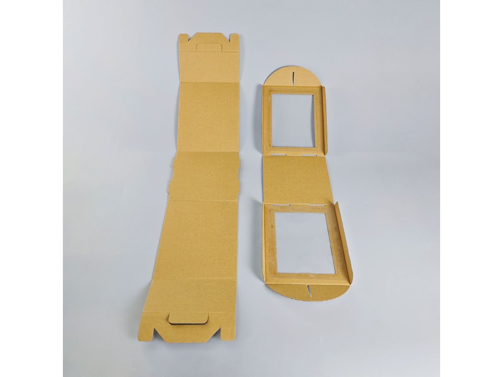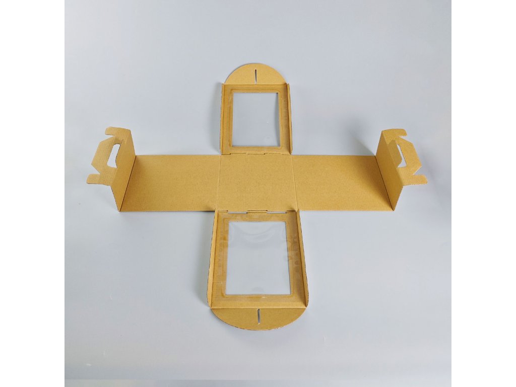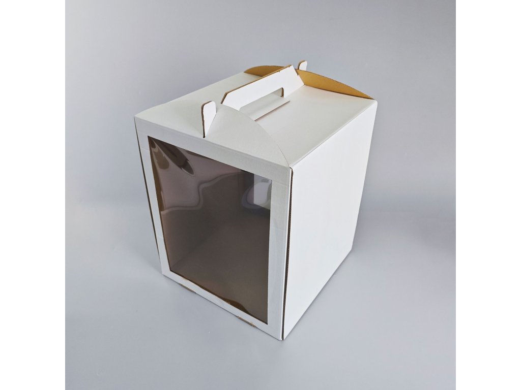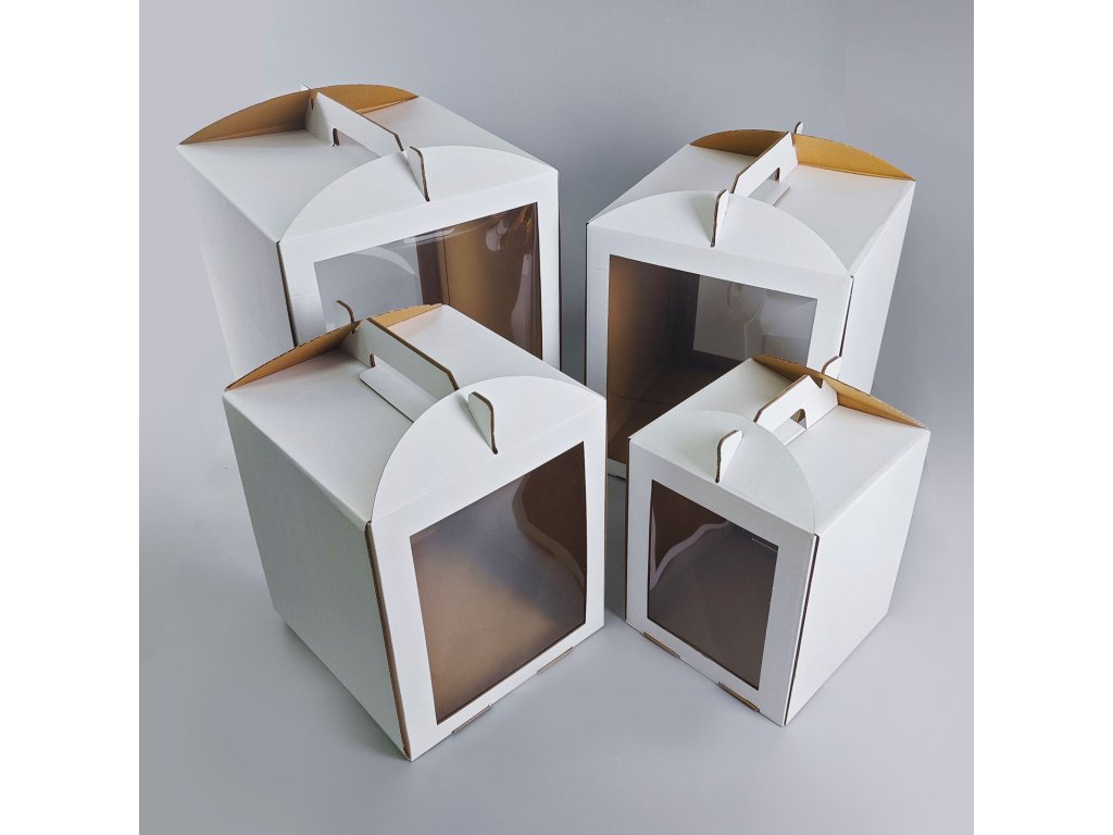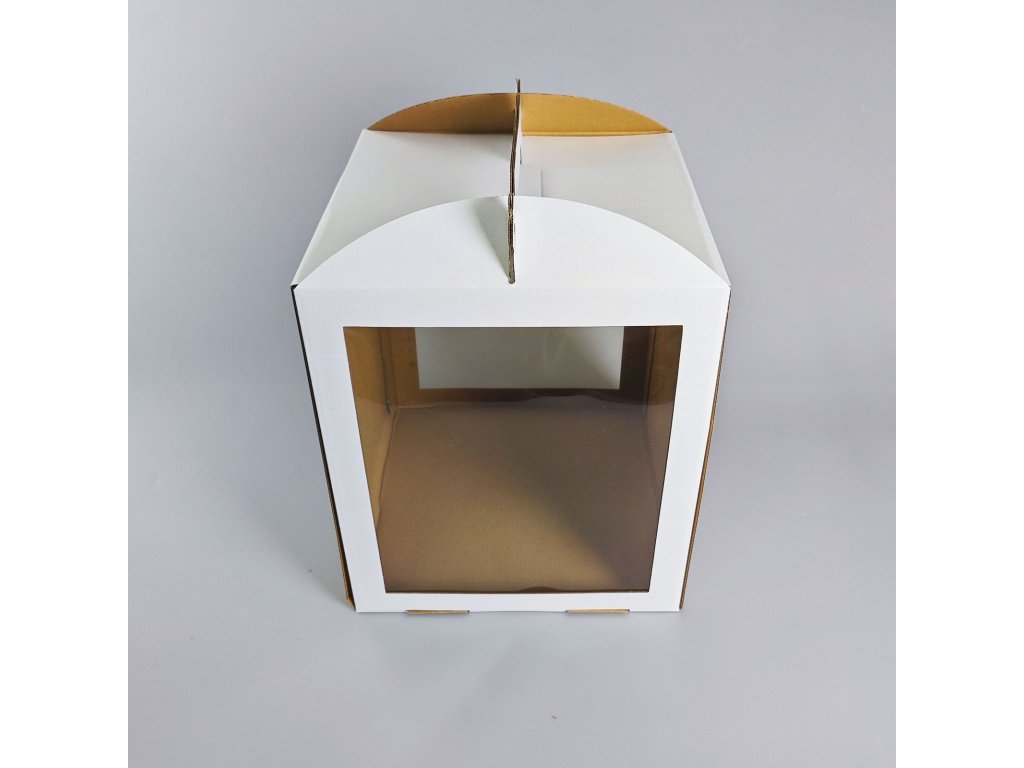 Vyrobena z pevného, kvalitního kartonu, který zajišťuje stabilitu a ochranu při přepravě. Dvě průhledná okénka umožňují snadné nahlédnutí na obsah, což ocení nejen zákazníci v cukrárně, ale i obdarovaní při předání dortu.
