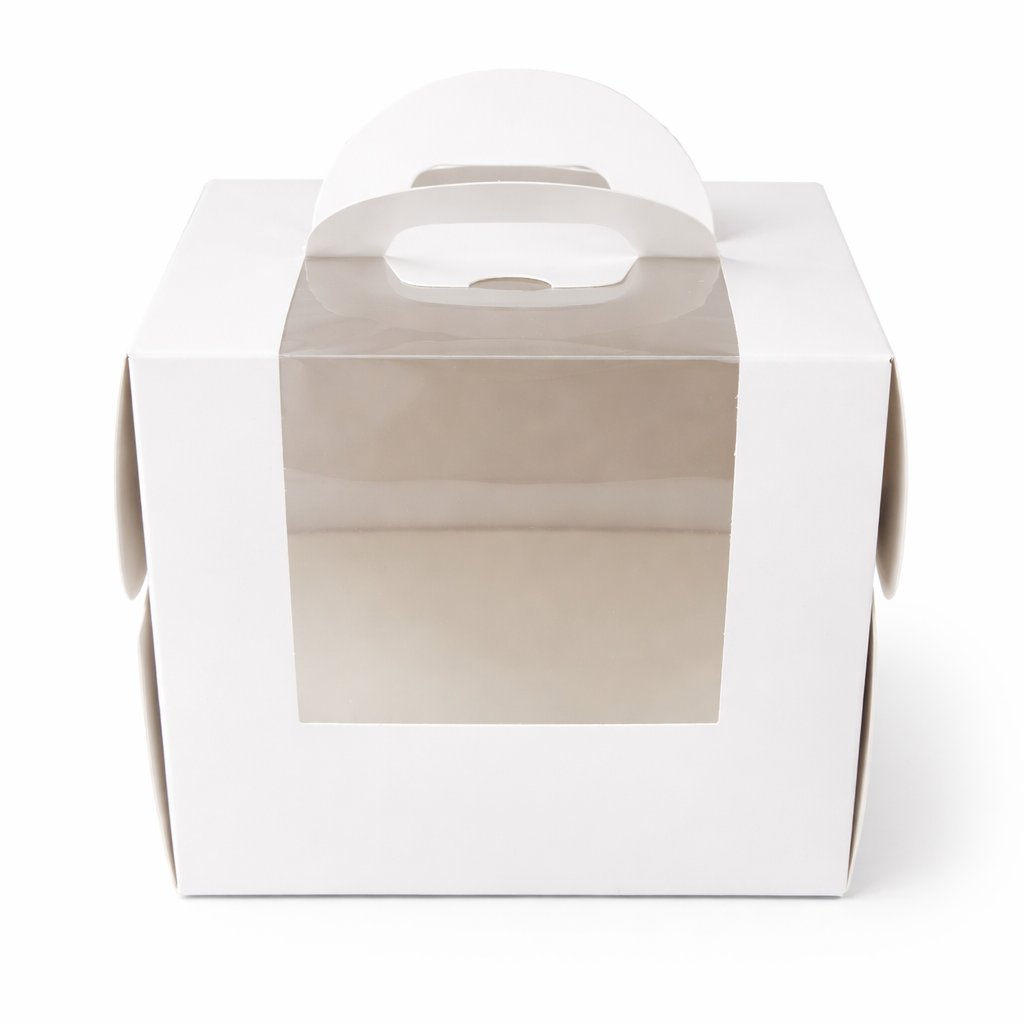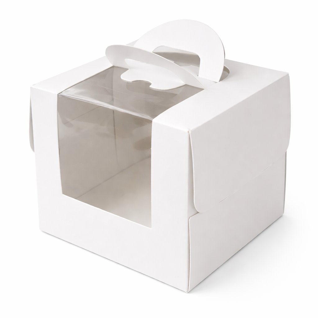 Krabice je vyrobena z pevného materiálu, který drží tvar i při manipulaci. Velkou výhodou je praktické ucho, díky kterému zákazník odnese dort pohodlně a bez rizika naklánění. Krabice působí čistě, minimalisticky a profesionálně – ideální i pro cukrárny, kavárny, catering a domácí cukráře.