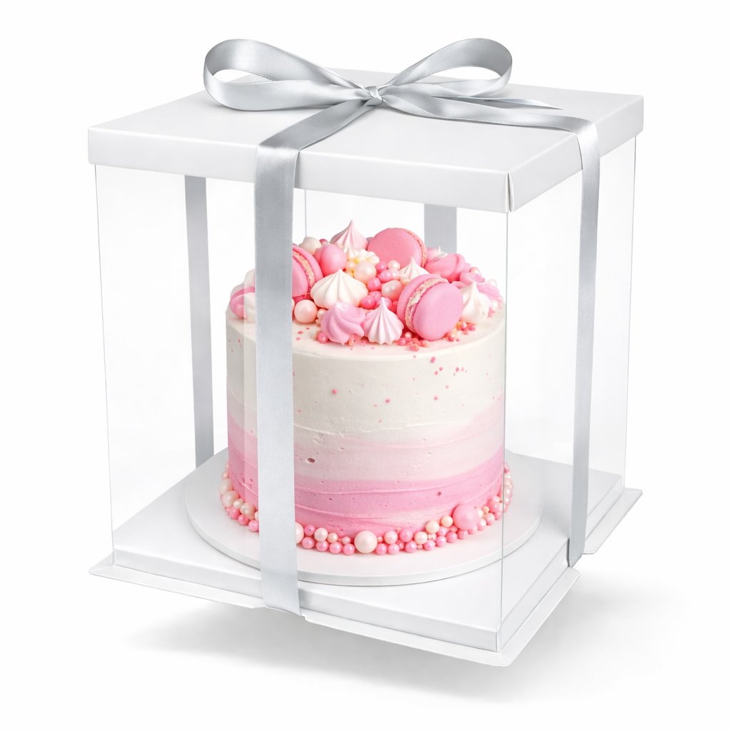 Elegantní průhledný box na dorty s bílým podnosem a víkem. Box je opakovaně použitelný, což vám umožní předvést své dorty při každé příležitosti.