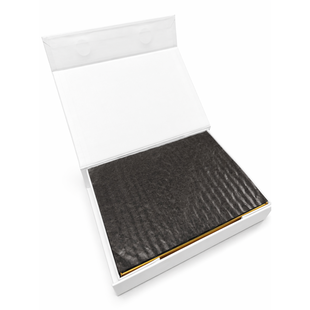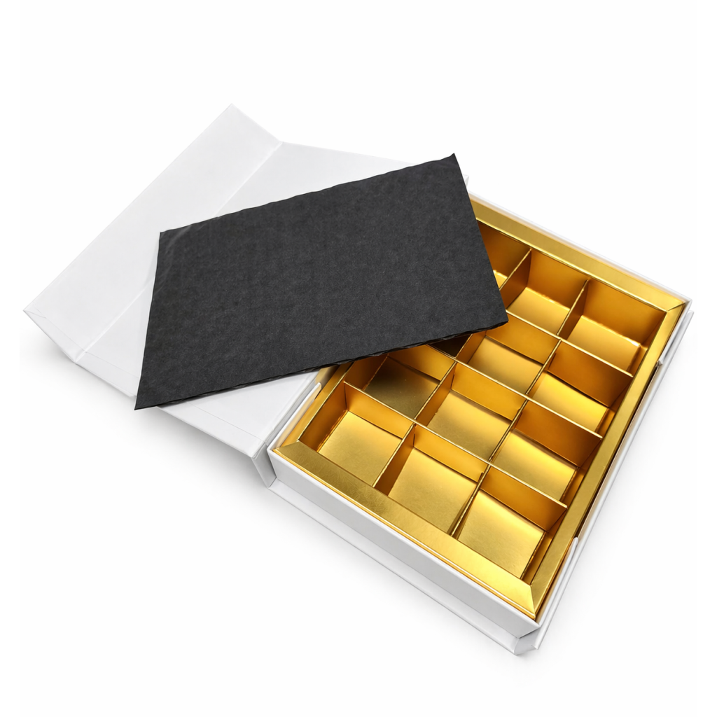 Dodejte svým pralinkám prémiovou prezentaci s touto elegantní krabičkou na 6 kusů. Kombinace čistého designu, pevné konstrukce a luxusního zlatého vnitřku vytváří dokonalý první dojem – ideální pro cukráře, čokolatiéry i dárkové balení.