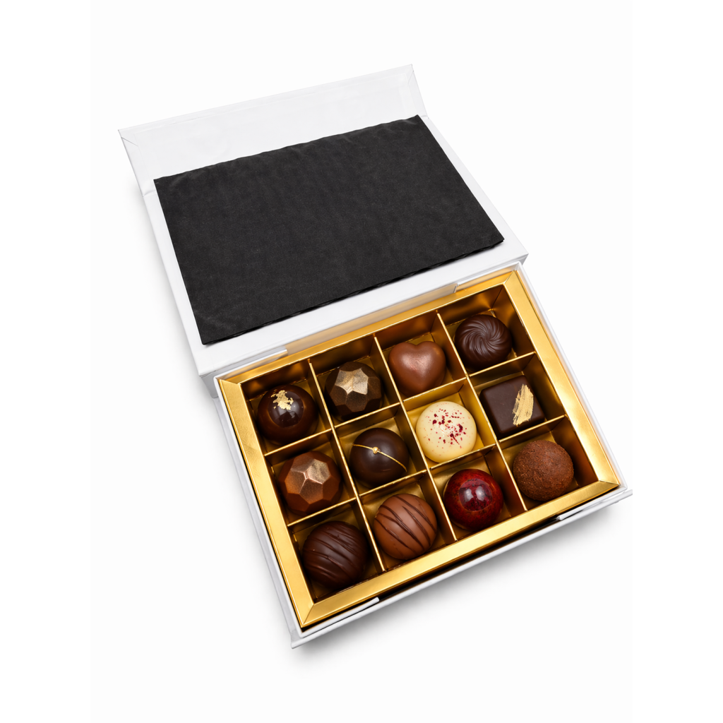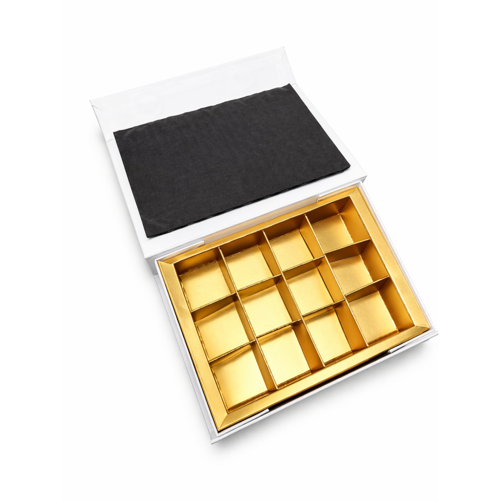 Krabička je vybavena magnetickým zavíráním, které zajišťuje pohodlné a bezpečné uzavření. Díky přesně tvarované vnitřní vložce zůstávají pralinky stabilně na svém místě a jsou perfektně prezentované.