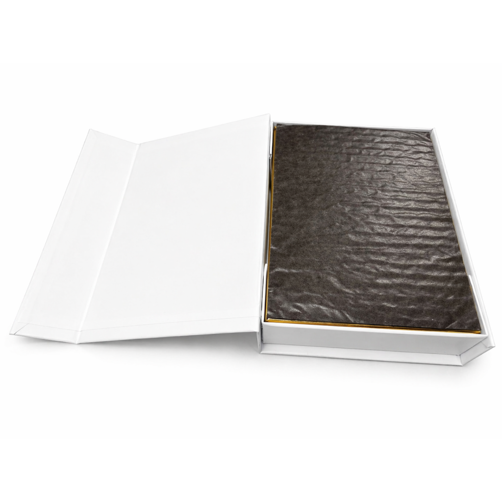 Minimalistický bílý exteriér v kombinaci se zlatým interiérem působí luxusně a nadčasově – vhodné pro slavnostní příležitosti, firemní dárky i prodej v cukrárnách.