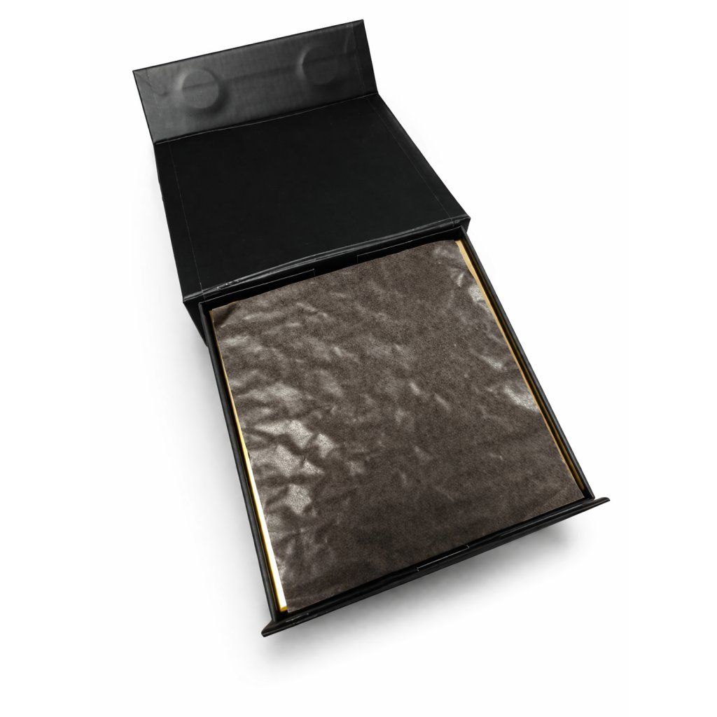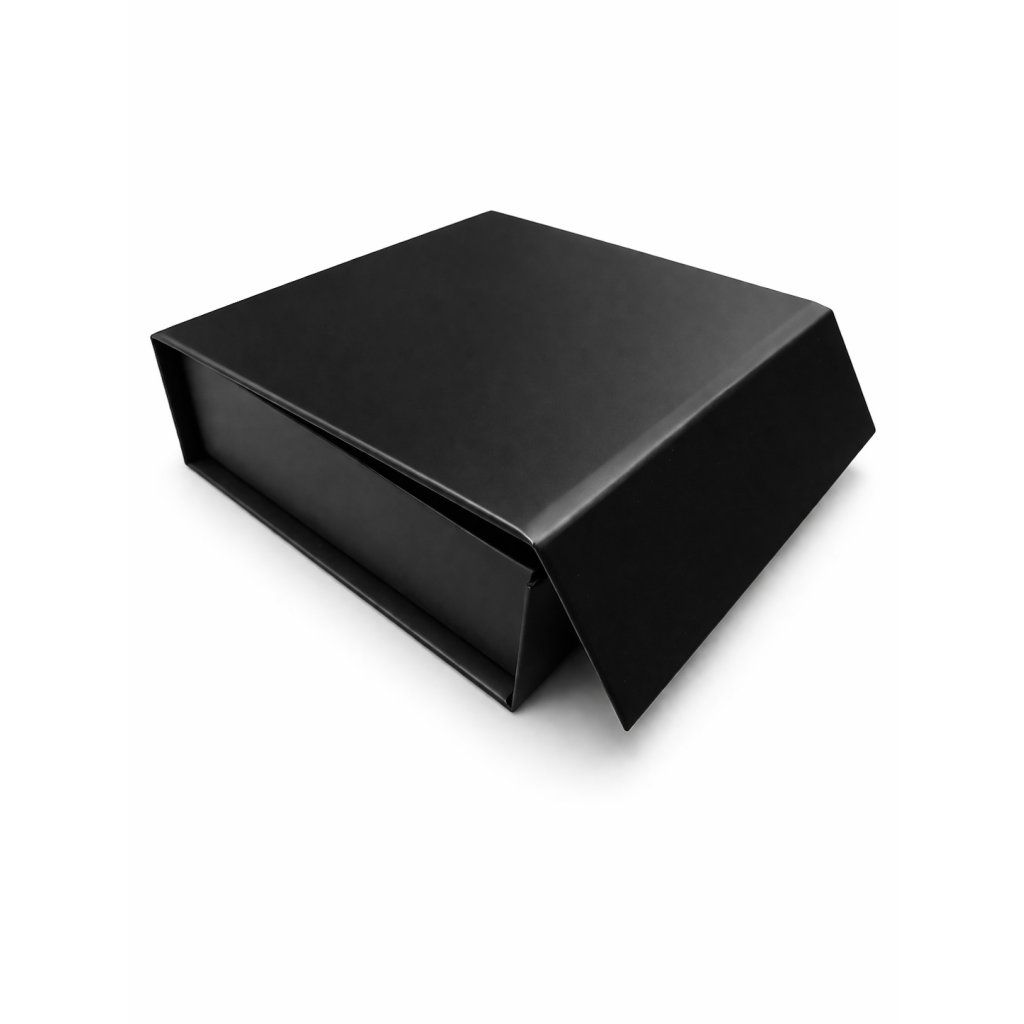 Minimalistický černý exteriér v kombinaci se zlatým interiérem působí luxusně a nadčasově – vhodné pro slavnostní příležitosti, firemní dárky i prodej v cukrárnách.