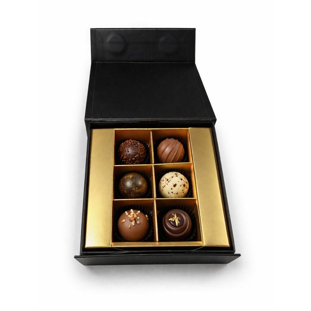 Dodejte svým pralinkám prémiovou prezentaci s touto elegantní krabičkou na 6 kusů. Kombinace čistého designu, pevné konstrukce a luxusního zlatého vnitřku vytváří dokonalý první dojem – ideální pro cukráře, čokolatiéry i dárkové balení.