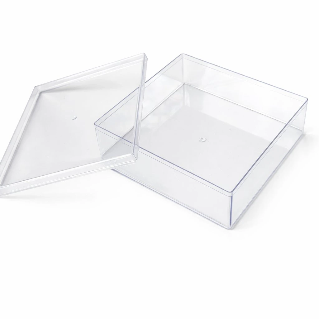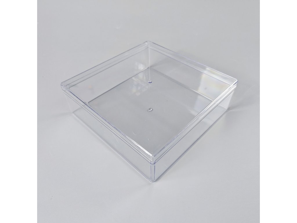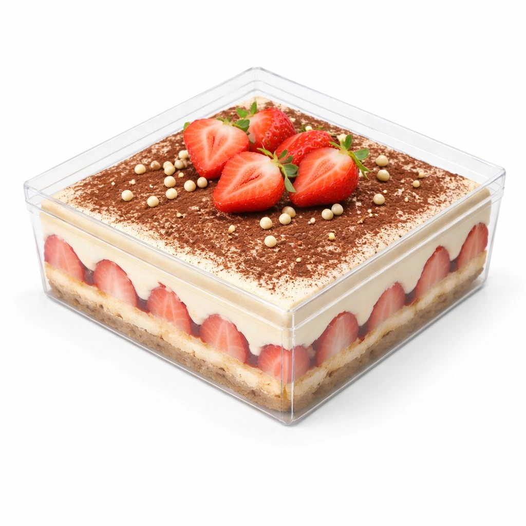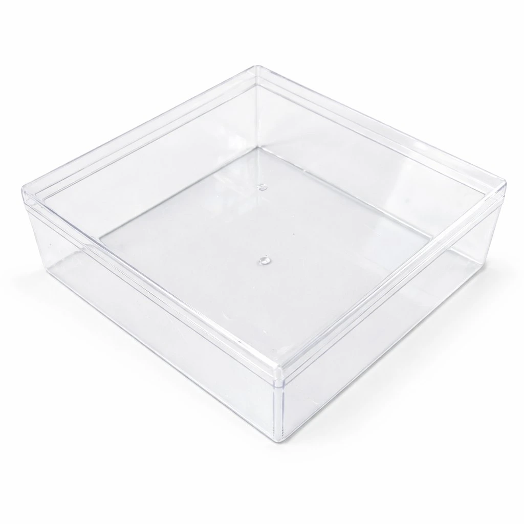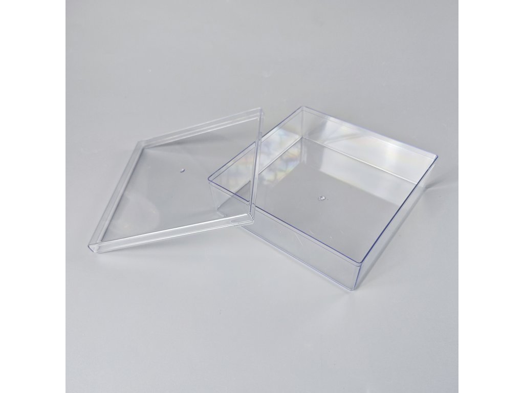 Čirá plastová krabička s víčkem o rozměrech 18,5 x 18,5 x 6cm je ideálním řešením pro balení a prezentaci dezertů, krémů, zákusků či mini dortíků.
