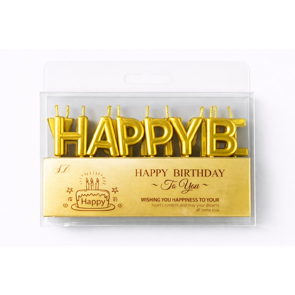 Narozeninové svíčky na dort, které mají zlatý nápis ”Happy Birthday”. Svíčky skvěle ozdobí váš narozeninový dort. Vhodné na jakýkoliv druh oslavy nebo party.