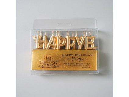 Narozeninové svíčky na dort, které mají zlatý nápis ”Happy Birthday”. Svíčky skvěle ozdobí váš narozeninový dort. Vhodné na jakýkoliv druh oslavy nebo party....
