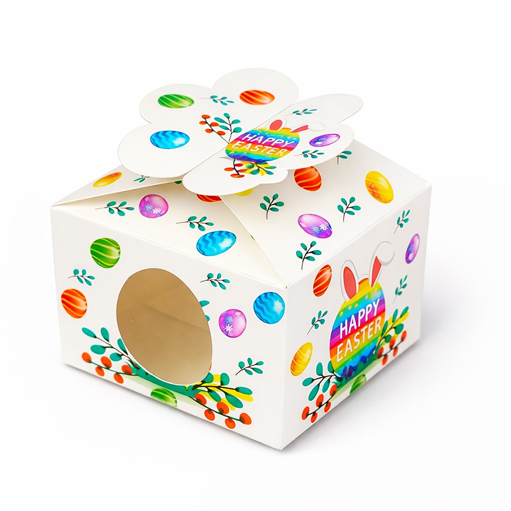 Tato veselá velikonoční krabička s průhledným okénkem je ideální volba pro cukráře, kavárny i domácí pečení.